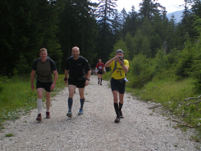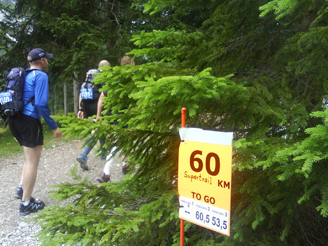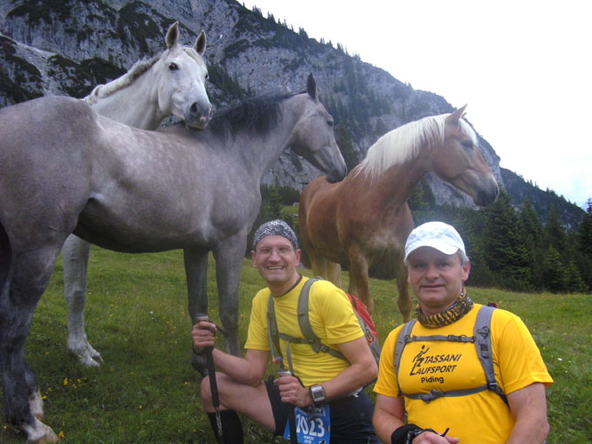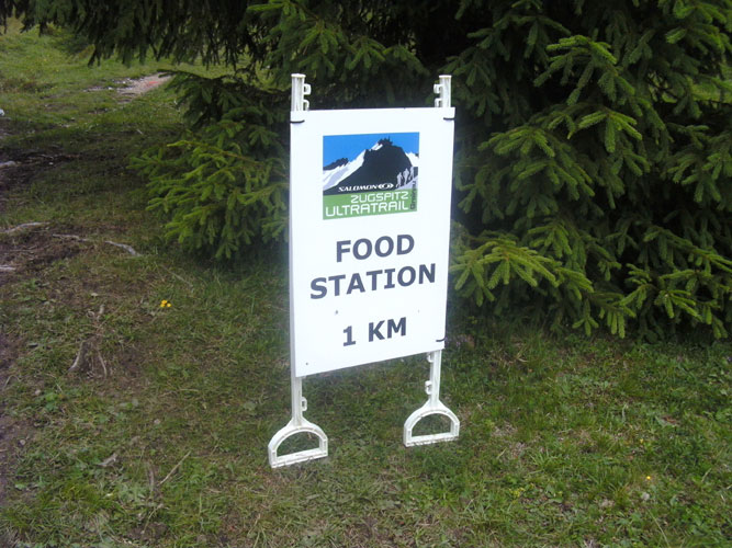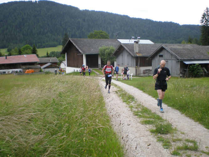 7,5 km bergab liegen am Hubertushof in Reindlau hinter uns, wo auf Mario und mich die nächste VP wartet. Der Cut liegt hier, nach nicht ganz 25 km bei 5:45 Std. Durch einen aufgeblasenen Tunnel geht es rein in die Station. Jede Menge Leute sitzen und stehen in der Röhre, ob hier auch der angekündigte Ärztecheck vorgenommen wird, kann ich nicht ausmachen, aber könnte sein. Aufgehalten werde ich jedenfalls nicht, vielleicht sehe auch noch zu gut aus, sie schaun aber auch nicht auf meine Oberschenkel. Interessanter wird es natürlich für den Dottore erst, wenn die Läufer des 100ter hier eintreffen.