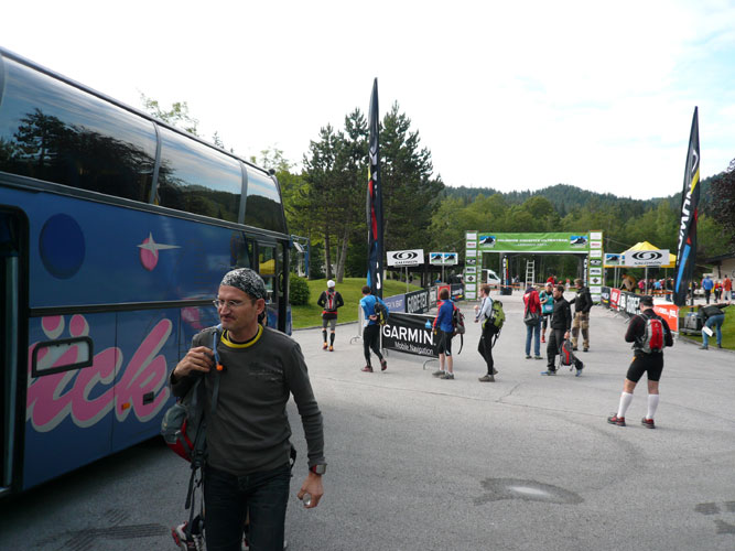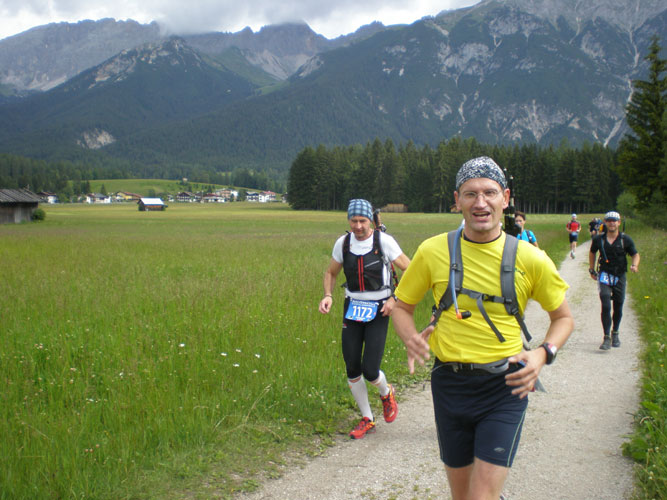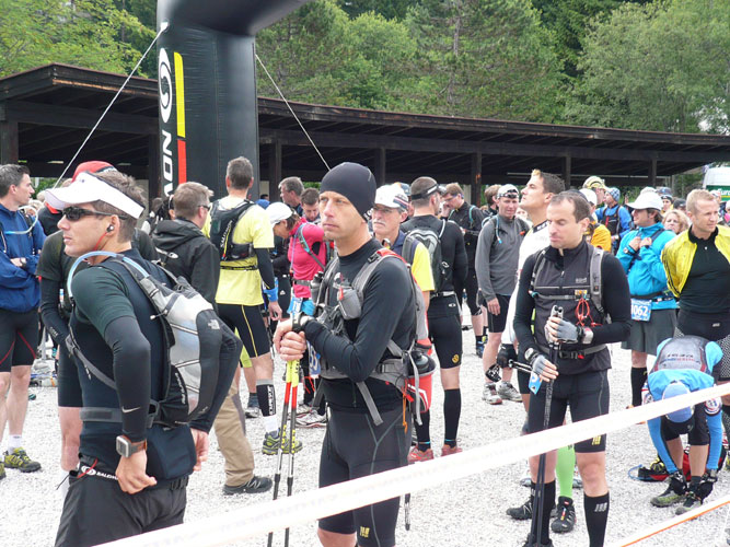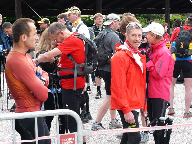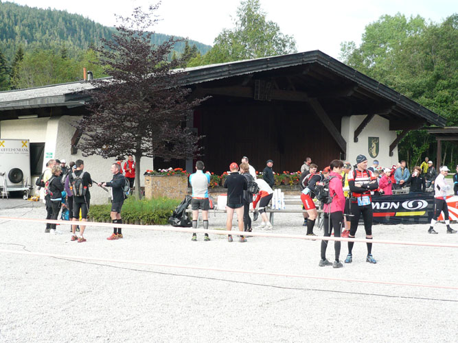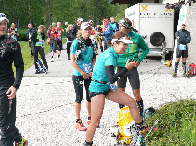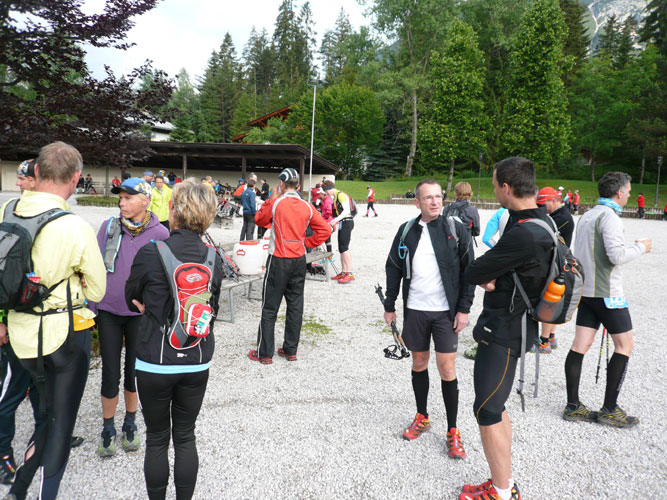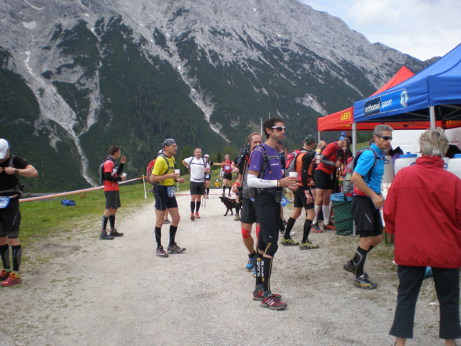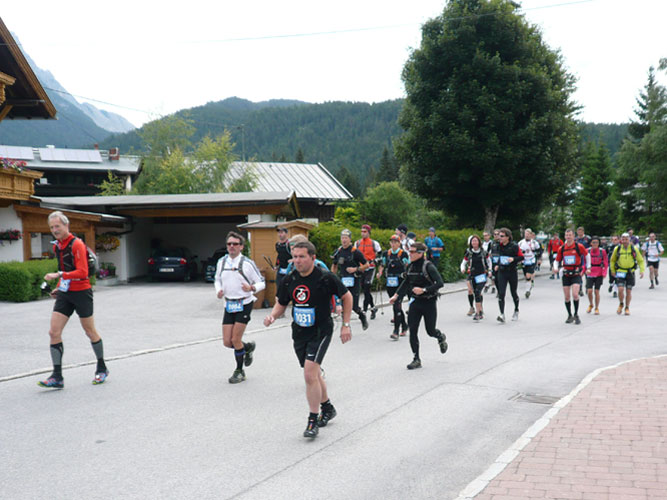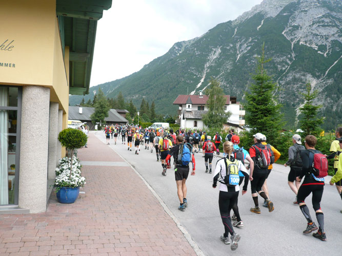 Fast eine Stunde dauert die Überführung nach Leutasch, Ortsteil Weidach. Es herrschen angenehme Temperaturen und hie und da blitzt sogar die Sonne durch die Wolken. 45 Minuten vor dem Start werden wir aufgerufen, um uns in die Startaufstellung zu begeben. 266 Läufer/innen stehen am Start und von jedem wird die Ausrüstung kontrolliert und das dauert etwas. Gut, wir müssen nichts, was wir mühevoll gepackt haben, wieder rauswerfen, aber die Herrschaften schauen schon rein, und lassen sich die wichtigsten Sachen zeigen. Trotzdem kommt mir bei manch einer/m der Rucksack schon sehr schmalbrüstig vor. Vielleicht hamm die ja ein Kondom als Regenüberzieherli dabei, da wäre gleich viel Platz gespart. Aber ist nicht meine Sache, ich hab auf alle Fälle alles parat.