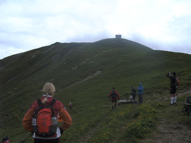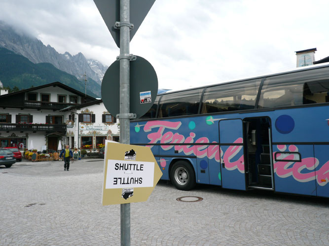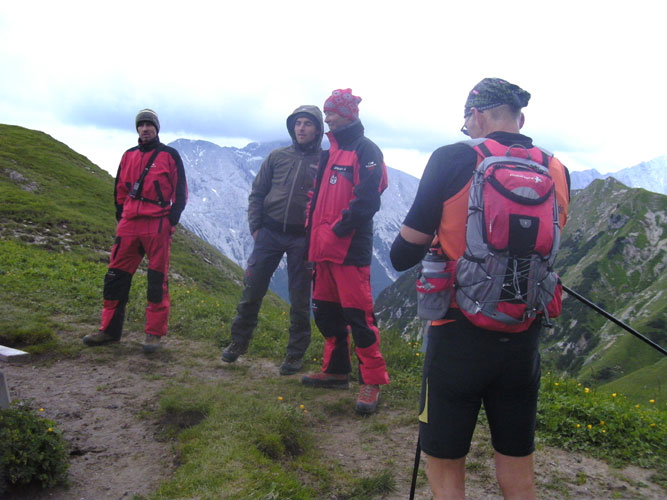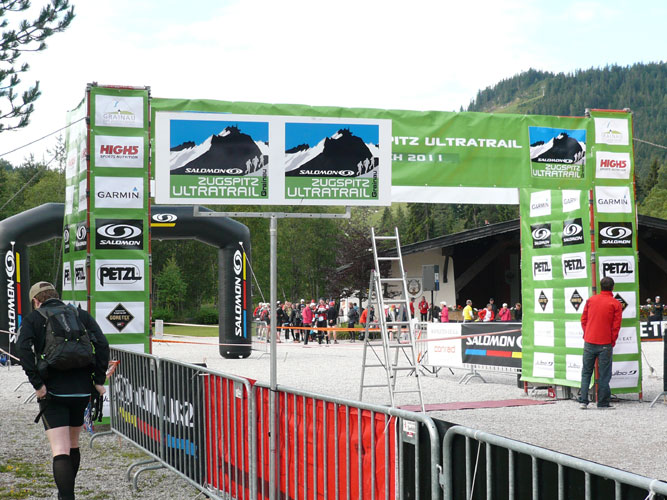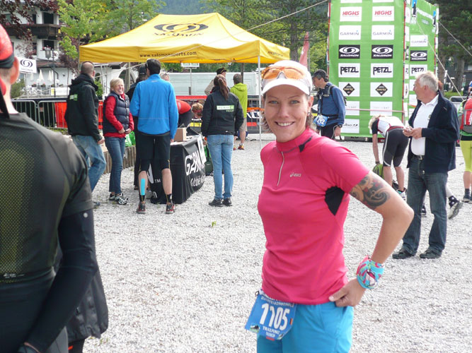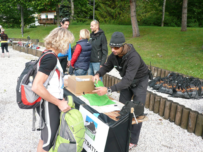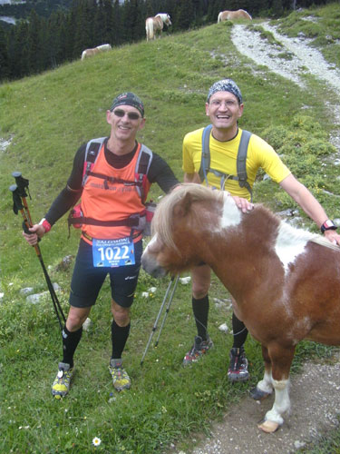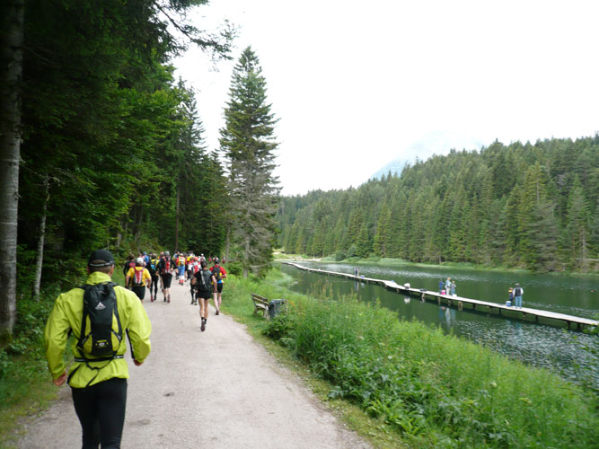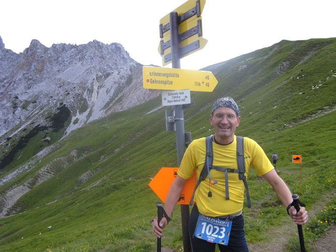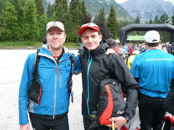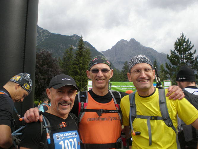 Fast eine Stunde dauert die Überführung nach Leutasch, Ortsteil Weidach. Es herrschen angenehme Temperaturen und hie und da blitzt sogar die Sonne durch die Wolken. 45 Minuten vor dem Start werden wir aufgerufen, um uns in die Startaufstellung zu begeben. 266 Läufer/innen stehen am Start und von jedem wird die Ausrüstung kontrolliert und das dauert etwas. Gut, wir müssen nichts, was wir mühevoll gepackt haben, wieder rauswerfen, aber die Herrschaften schauen schon rein, und lassen sich die wichtigsten Sachen zeigen. Trotzdem kommt mir bei manch einer/m der Rucksack schon sehr schmalbrüstig vor. Vielleicht hamm die ja ein Kondom als Regenüberzieherli dabei, da wäre gleich viel Platz gespart. Aber ist nicht meine Sache, ich hab auf alle Fälle alles parat.