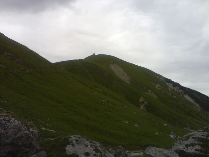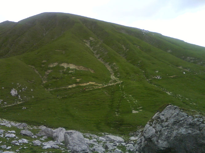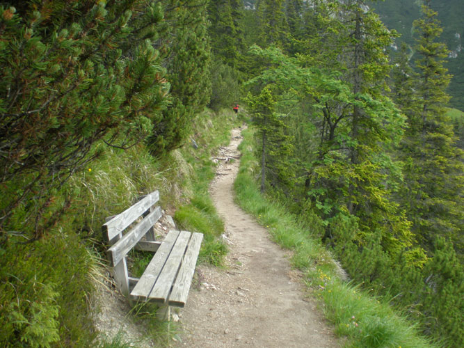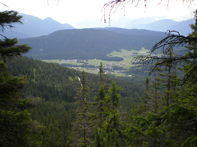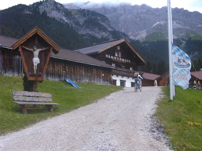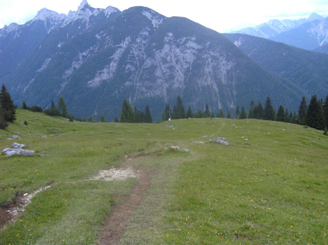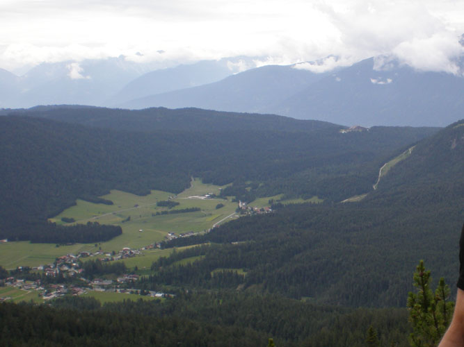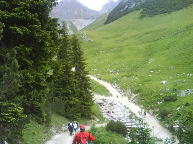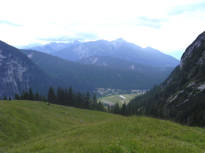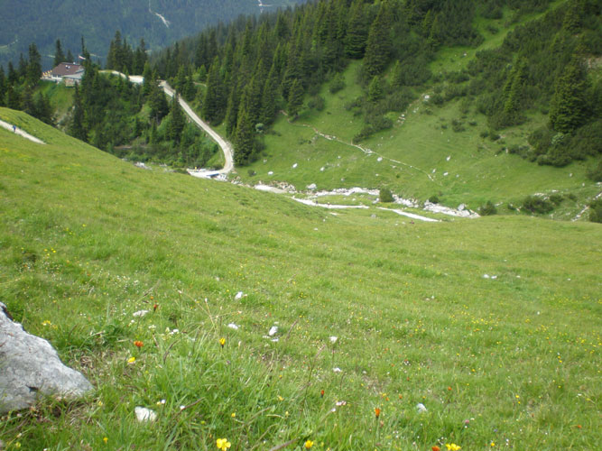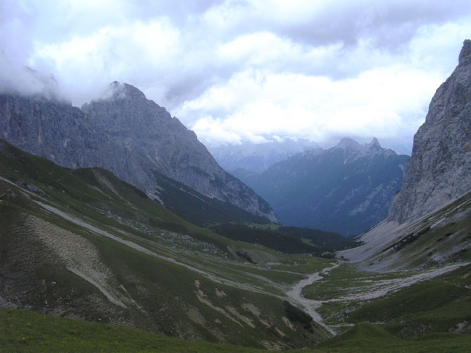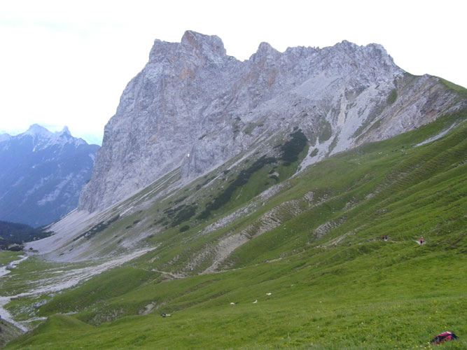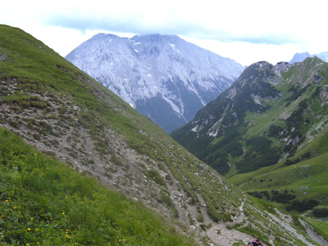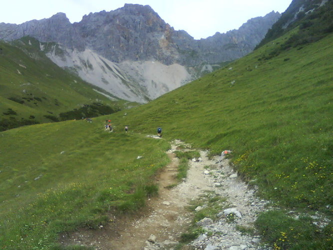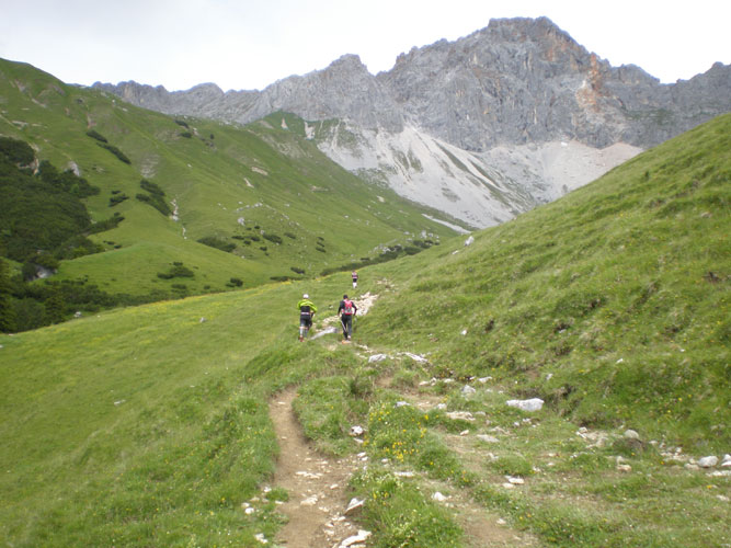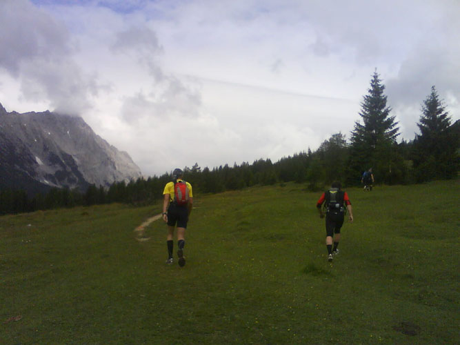Im Sandwich zwischen Gehren- und Leutascher Dreitorspitze geht es runter vom Berg. Der 1050 Hm lange Abstieg ist aber nicht von Pappe. Durch die Regenfälle der Nacht sind die Pfade und Wiesen, durchsetzt mit Felsen und Steinen, äußerst glitschig und schlammig. An manchen Stellen pappt einem der Dreck zwischen den Stollen, was das Gewicht der Schuhe gefühlsmäßig gleich verdoppelt. Ab der Waldgrenze kann man es wieder mehr laufen lassen. Aber das Ganze geht unglaublich in die Oberschenkel und die sind jetzt fast am platzen, da bräuchte es jetzt Muskelpakete wie sie manche Radler haben.