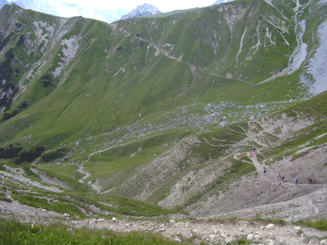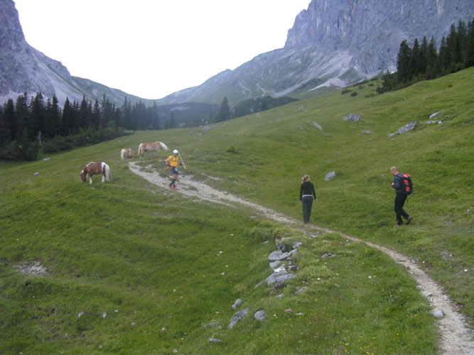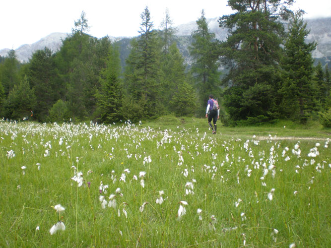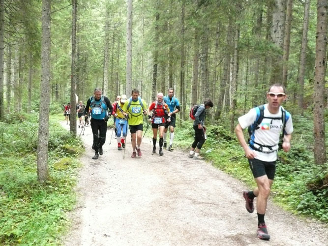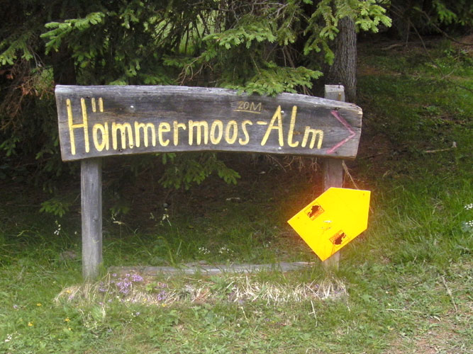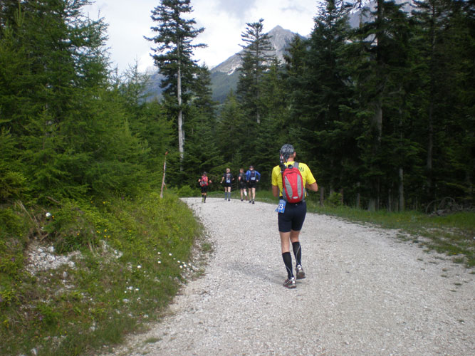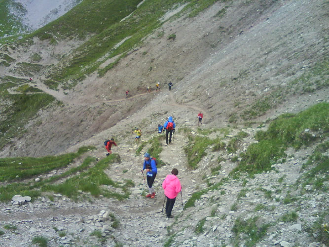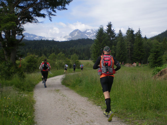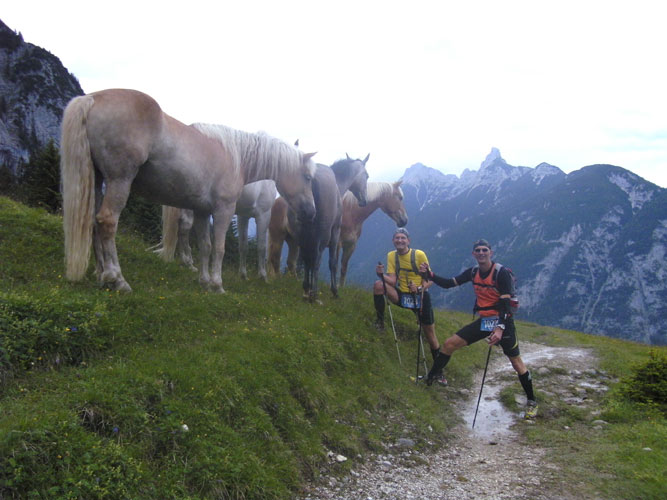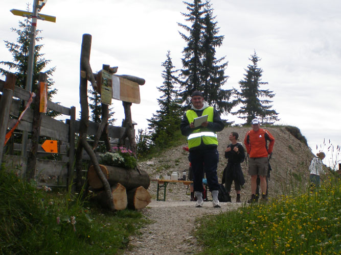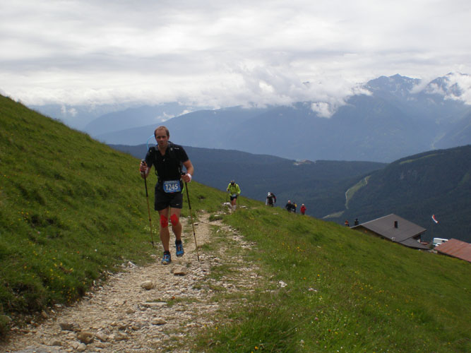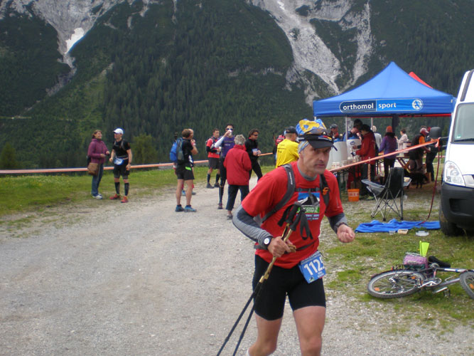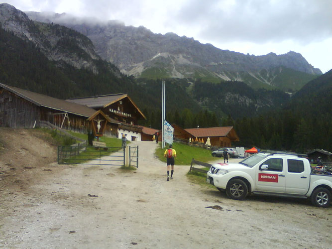 Nach 11 km mit gemäßigten Auf und Ab‘s erreichen wir die Hämmermoosalm (1417 m), wo für uns Supertrailer die erste und für die UTler die 4. Versorgungsstation aufgebaut ist. Kurz zuvor fand die Streckenvereinigung beider Distanzen statt, bisher sind aber noch keine UT-Läufer durchgekommen. Alle ST-Läufer müssen hier um 11:30 Uhr durch sein, das dürfte aber wohl jeder geschafft haben, ich habe 1 Std. plus. Das Höhenprofil unseres Roadbooks verspricht uns ab hier viele Höhenmeter hinauf zum Scharnitzjoch. Grund genug, um zum ersten Mal in meinem Laufleben die empfohlenen Teleskopstöcke als Aufstiegshilfe auszuprobieren.