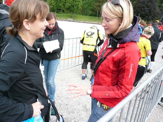Leckere Tomatensuppe ist das erste was ich mir an Verpflegung schnappe und dann gleich im Liegestuhl verspeise. Das ist wirklich ein guter Service, meine Muckis danken es. Eine ganze Menschenmenge hat sich hier versammelt, weniger Läufer, denn Betreuer und Serviceleute. Der Streckenchef ist auch da und einige Reporter mit Kameras, die werden wohl kaum wegen mir da sein. Nein, natürlich nicht, schon kommt der erste der beiden spanischen Favoriten vom UT angerauscht. Kurz hinter Miguel Heras kommt auch der zweite Iker Karrera Aranburu an. Zwei bis drei Minuten werden sie sich wohl aufgehalten haben und schon sind sie wieder weg. Unmittelbar danach kommt unser deutscher Crack Matthias Dippacher rein. Sofort stürzen sich die Kameraleute auf ihn. Mit der Kamera unter der Nase muss er sich hier verpflegen. Schon mal interessant das mittendrin zu beobachten. Da schieße ich natürlich auch ein paar Fotos aus nächster Nähe.
