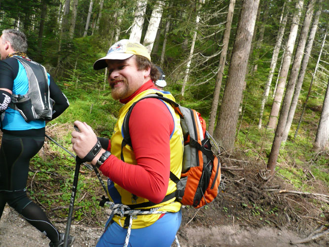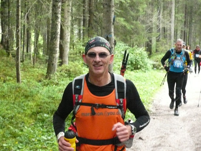 Um 9 Uhr wird gestartet und als StartUp hätte ich jetzt eigentlich gedacht wird der offizielle Song „Coming home“ gespielt, der beginnt nämlich gleich sehr eindrucksvoll und passend mit: „Here I stand…“ aber Pustekuchen, AC/DC jagen uns mit „Highway to Hell“ aus Weidach hinaus. Passt natürlich zugegebenermaßen auch optimal, für wie viele es einer geworden ist, werden wir in den Ergebnislisten lesen können. Einen Kilometer nach der Ortschaft geht es am Weidacher See an den Preisfischern vorbei und danach rein in den Wald mit den ersten noch mäßigen Steigungen. Nach nicht einmal zwei Kilometern verliere ich schon eine meiner Wasserflaschen. Die Befestigung an der Stelle habe ich auch noch nie zuvor ausprobiert und jetzt weiß ich, da hält sie auf Fälle nicht. Ich hätte auch eine Trinkblase wählen können, aber mich nervt das ständige Wassergeschüttele im Rucksack, sodass ich Flaschen bevorzuge. Da ich noch wenig getrunken habe, transportiere ich sie vorerst noch in der Hand um mich mit Flüssigkeit zu versorgen.