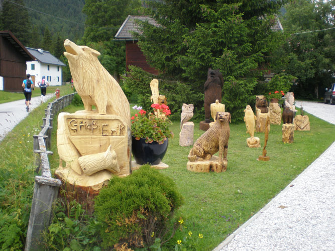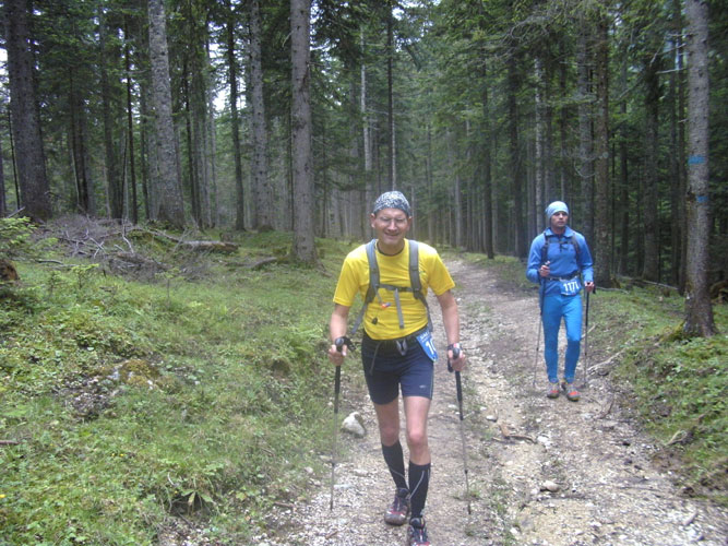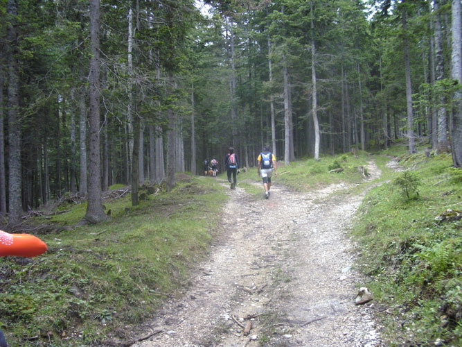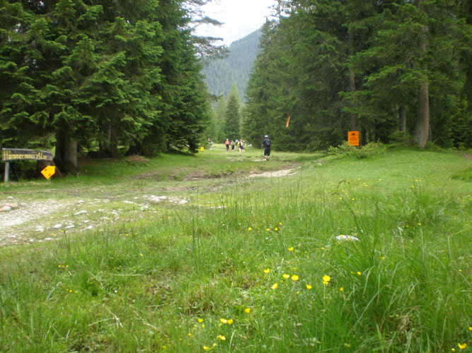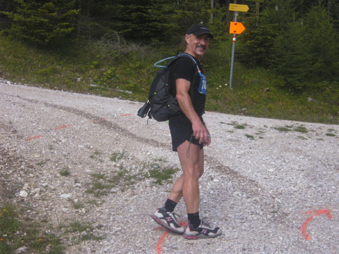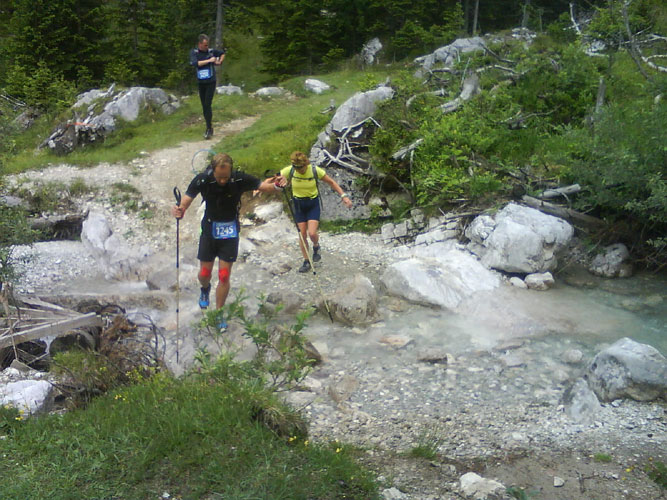 Die nachfolgenden Kilometer auf einem Steig durch den Gutwald lassen mein Trailer-Herz höher schlagen. Es geht wellig durch den Wald und am Hang entlang, teils mit toller Aussicht nach unten, über Wurzeln, Stock und Stein und ein Bach muss auch einmal durchquert werden. Die Steigungen sind oft laufend noch gut zu bewältigen, die Trail-Poles stören mich deshalb noch hin und wieder. Aber heute bleibt noch viel Zeit um mit ihnen eine Einheit zu werden. Die Strecke ist bisher hervorragend markiert, ich kann keine Problemstellen erkennen. Plötzlich mittendrin, an der Wangalm stehen Kontrolleure und notieren unsere Startnummern, schwarze Schafe soll es ja überall geben.