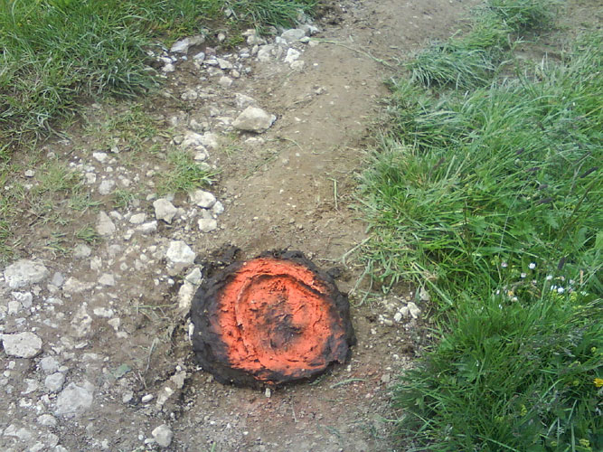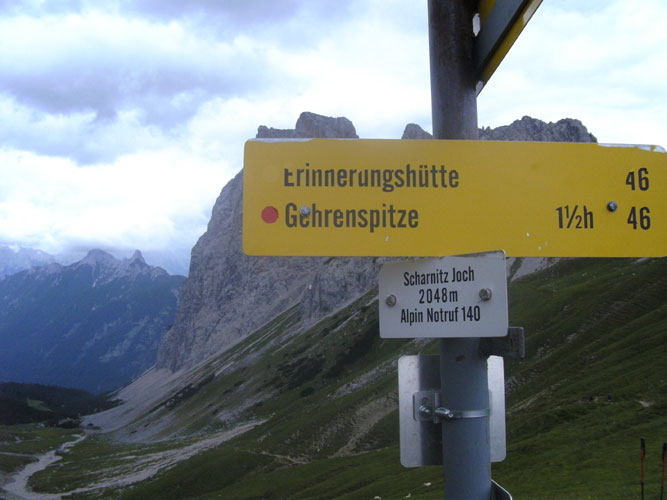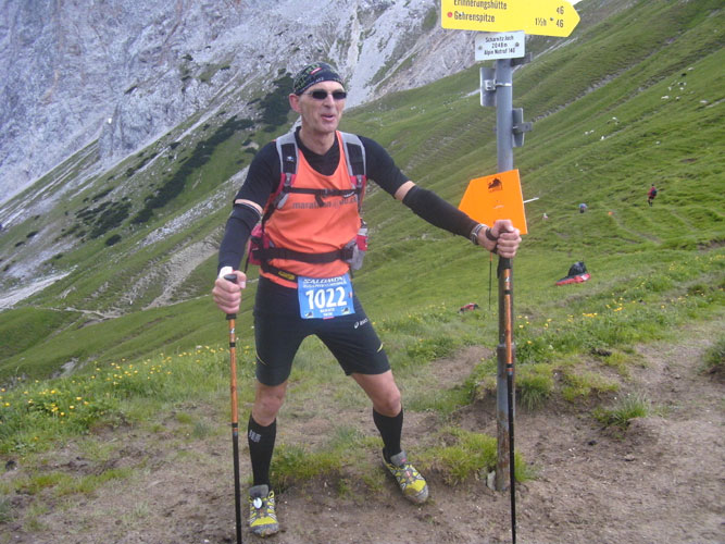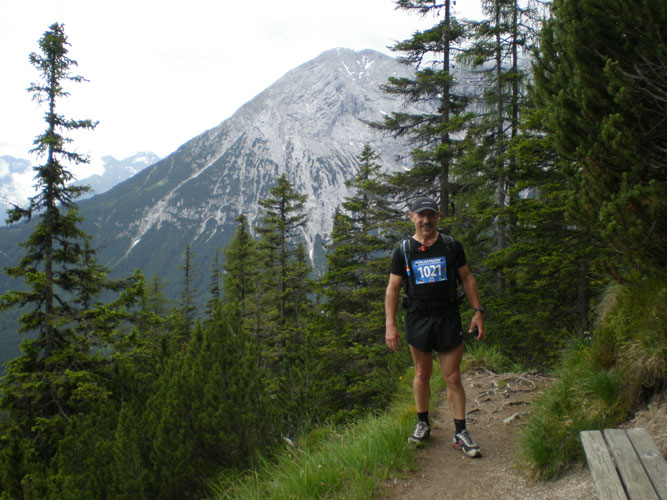 Nach der Kontrollstelle verlassen wir die Baumgrenze, es geht in einen alpinen Bereich über und es wird deutlich rustikaler und steiler. Jetzt bin ich froh die Stöcke richtig einsetzen zu können. Eine Tellermine versperrt uns an einer Engstelle den Weg, die Streckenmarkierer haben gute Arbeit geleistet und den Kuhfladen mit greller Farbe markiert. Das muss ich natürlich per Foto festhalten, aber die Handyfotografiererei nervt mich tierisch, es ist mir einfach zu unkomfortabel und kostet sehr viel Zeit. Der Südwandsteig führt uns hinauf auf das Scharnitzjoch, dem zweithöchsten Punkt der Supertrail-Runde.17 km und 1150 Hm haben wir hinter uns. Ein letzter Wiederbelebungsversuch meines Fotoapparates schlägt fehl, ich fühle mich irgendwie wie auf Entzug. Als mir Mario seine anbietet, lasse ich mir das natürlich nicht zweimal sagen. Die großartige Aussicht kann ich so gleich mit einer Serie ablichten.
