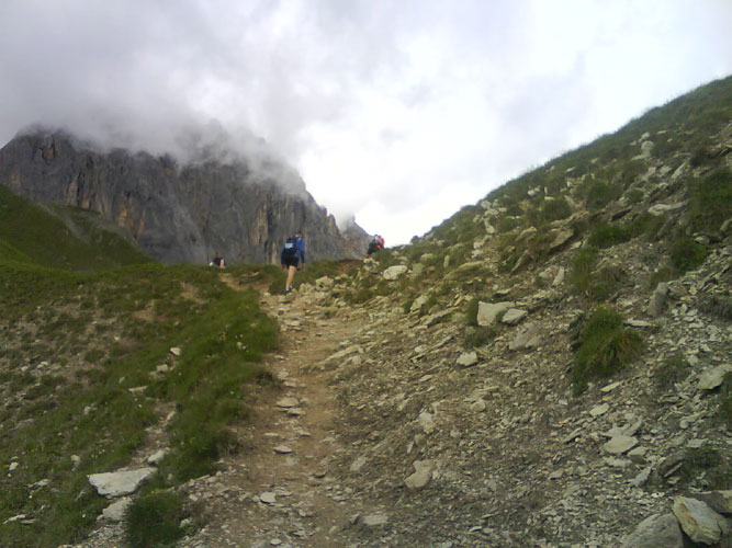 Von Didi kann ich noch ein schönes Bild machen, dann passiert’s, beim Hochziehen des Verschlusses verpasse ich meiner Optik eine Direkteinspritzung. Es geht nichts mehr, so viel ich auch zu zaubern versuche, vom Akkuwechsel bis zur Reinigung. Für mich ist das der reinste SuperGAU, noch 66 km zu laufen mit den schönsten Aussichten in spe und keine funktionierende Kamera. Nach ein paar Minuten gebe ich auf, jetzt muss ein Plan B her. Mario und Jan haben auch ihre Kameras dabei und laufen noch in meiner Nähe, ich bitte sie für mich Fotos zu schießen, ist für mich natürlich nicht sonderlich befriedigend. Dann fällt mir ein, wir haben ja auch Notfallausrüstung am Mann und Handy ist auch an Board, wie praktisch. Die Kamerafunktion ist zwar umständlich aber in der Not frisst der Teufel Fliegen.
