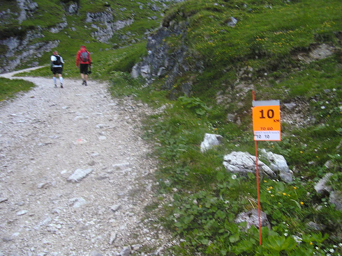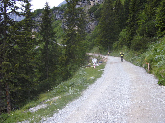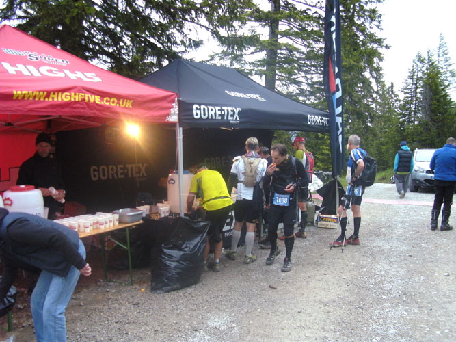 Zurück an der Längenfelder Station lasse ich mir als erstes noch einmal die Tomatensuppe schmecken. Wieder nach Cola zu fragen, verkneife ich mir, ich habe ja nur mehr dieses „kleine“ Reststück den Berg runter. Die Ultratrailer benötigen diese kurze Energiezufuhr sicher nötiger als ich, vor allem weil ich mich auch immer noch sehr gut fühle. Ich würde jetzt gerne für den Talablauf meine Stöcke wegpacken, frage aber mal vorsichtshalber nach, wie sich die Strecke den noch so gestaltet. „Ich würde sie schon noch verwenden, es kommen noch ein paar heikle Abschnitte“ bekomme ich als Antwort.