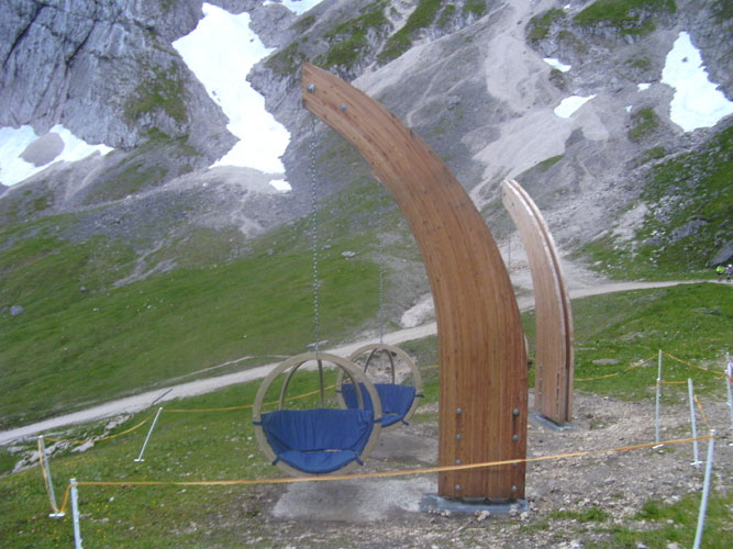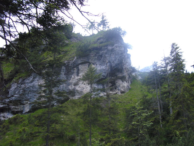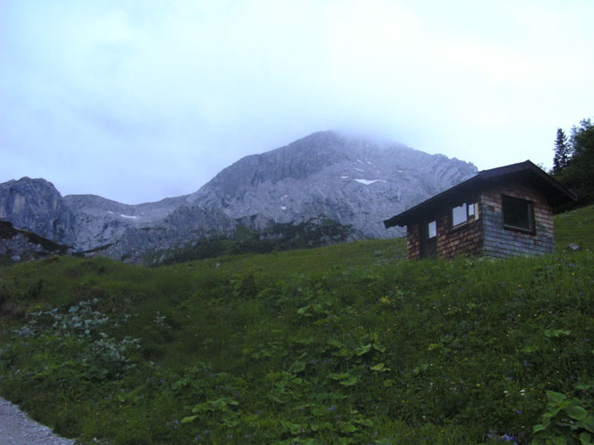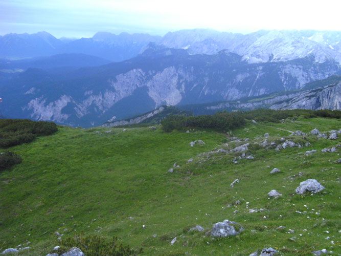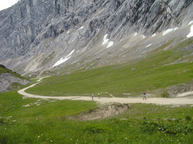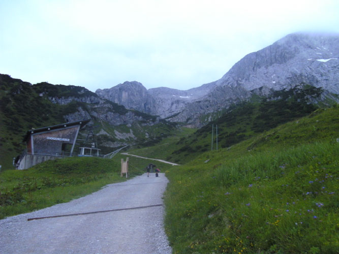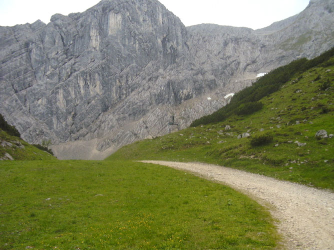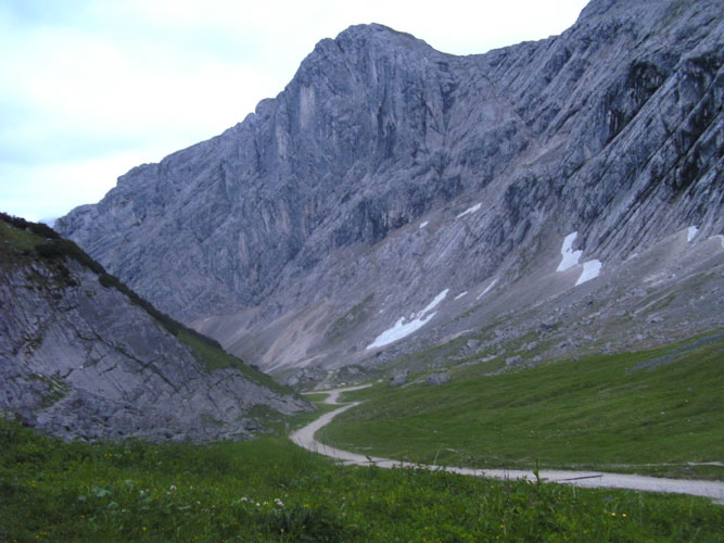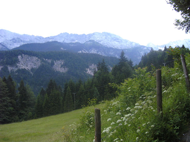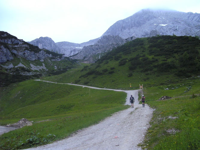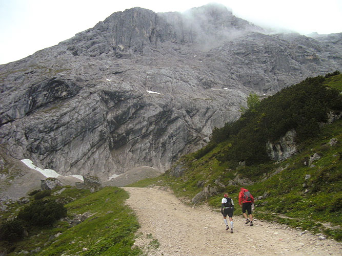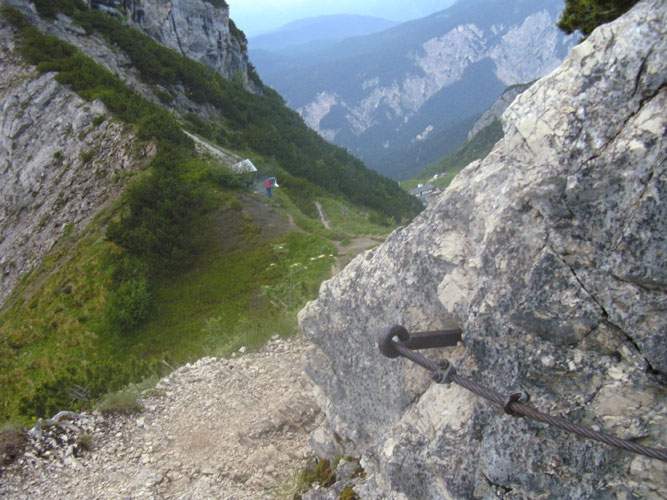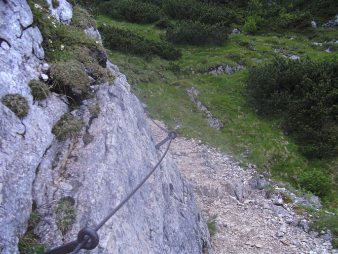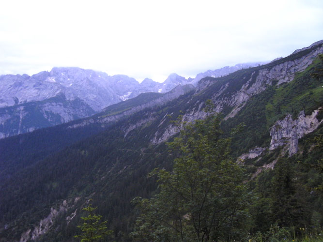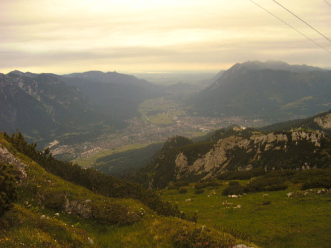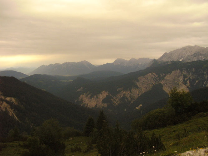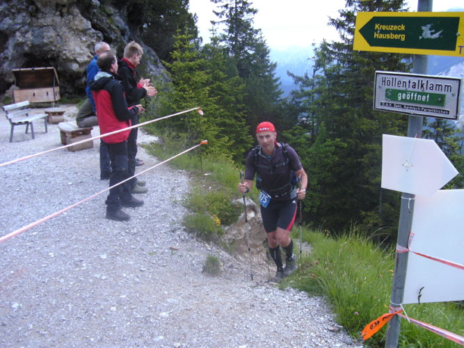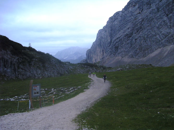 Kurz nach dem 10KM-TO-GO-Schild habe ich den höchsten Punkt dieses Aufstiegs (2029m) erreicht. Etwas unterhalb der Alpspitzbahn-Bergstation geht es wieder runter. 1300 Hm abwärts liegen jetzt vor mir. Vom Steig in der Felswand ist der Blick hinunter nach Garmisch am eindrucksvollsten. Aber es wird schon ganz langsam dämmrig, eigentlich will ich die Stirnlampe heute nicht benützen. Mir ist der aber der Abstieg hier viel zu gefährlich und nehme lieber kein allzu großes Tempo auf. Vom Veranstalter sind auch Schilder aufgestellt „Achtung Beginn gefährliche Passage“. Habe ich im Hellen natürlich auch schnell erkannt, weil es ein paar Zentimeter links steil nach unten geht. Aber der Großteil der UT-ler muss hier in der Nacht runter und das ist bestimmt kein Zuckerschlecken und nicht so leicht erkennbar. Bereits jetzt ist das schon saugefährlich, weil es zwischendrin immer mal leicht nieselt und das Gestein rutschig ist.
