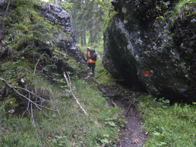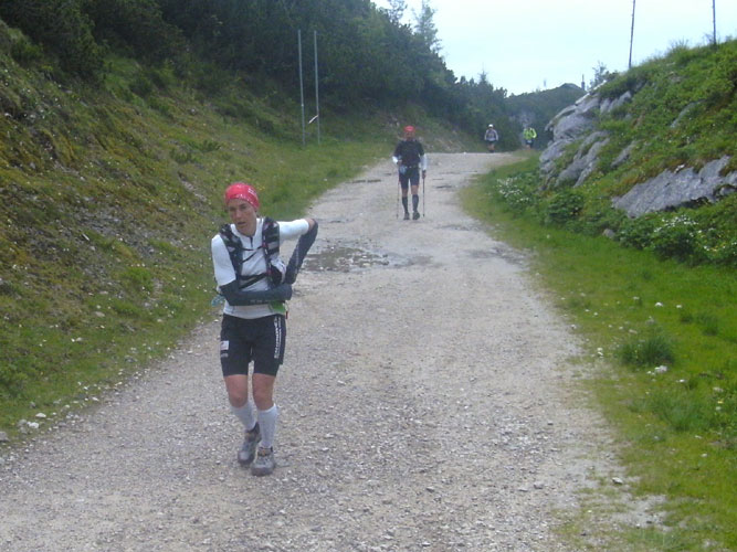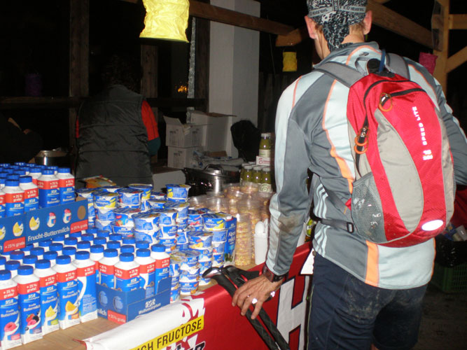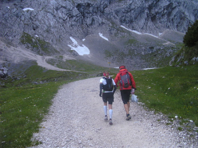 140 Bergwachtler stehen heute an vielen Stellen bereit, jetzt am Abend haben sich viele ein Feuer gemacht und eine Zeltplane aufgespannt um darunter die Nacht zu verbringen. Größten Dank von meiner Seite an alle an dieser Stelle und auch den vielen sonstigen Betreuern an der Strecke, die über einen so langen Zeitraum bereit stehen um uns zu helfen oder im Notfall einzuspringen. Die Wegmarkierungen sind trotz Dunkelheit für mich problemlos auszumachen und so finde ich die richtige Spur nach unten. Zum Abschluss bekommen wir noch eine ganz enge, supersteile und rutschige Passage geboten, die es gewaschen hat. Auch wenn ich mich wiederhole, dieser Bergabstieg ist der Wahnsinn. Später erfahre ich, dass es hier herunter Jan einmal richtig überschlagen hat und Mario hat sich gleich 3 x lang gelegt. Und auch Daniel hat Bodenkontakt gehabt, vielleicht schreibt er ja darüber in seinem Bericht.