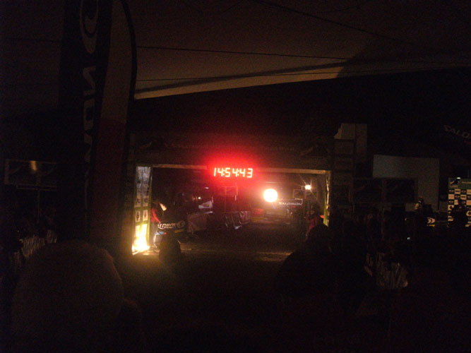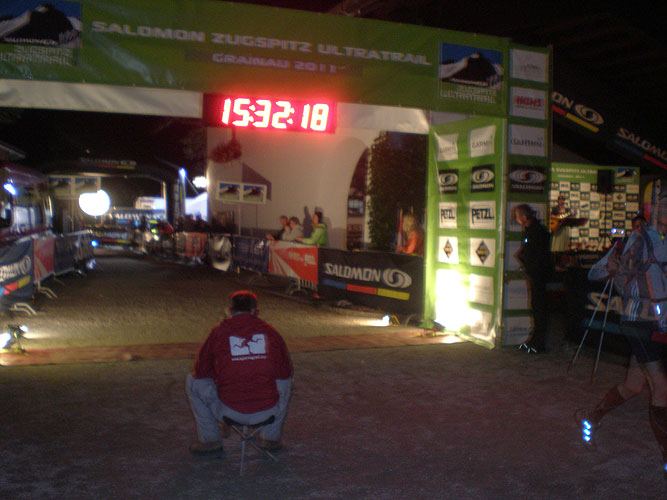 Die beiden Schlusskilometer führen über Teerstraßen nach Grainau, viele Anwohner stehen vor ihren Häusern und feuern uns an. Ich hätte heute sogar noch ein paar Kilometer drauf, kann alles durchlaufen und ein paar Verfolger abschütteln, ich fühle mich immer noch prächtig. Zu Mitte des Rennens hätte ich davon nicht zu träumen gewagt. Der Zieleinlauf in der Nacht, nach über 13 Stunden ist wirklich absolut geil und ein unglaubliches Glücksgefühl führt mich hinein ins „Zelt“ des Musikpavillion wo ich von vielen Menschen mit Applaus empfangen werde. Jan ist schon über eine Stunde da und Mario kommt 40 Minuten nach mir – trotz Stürze – wohlbehalten rein.
