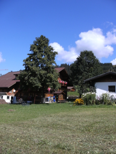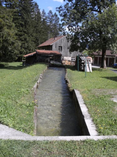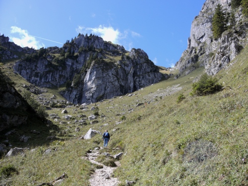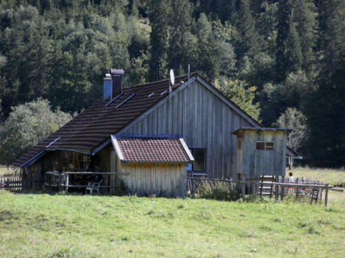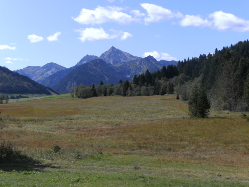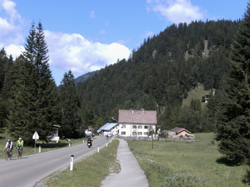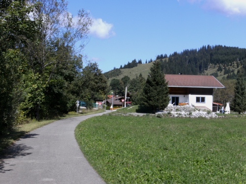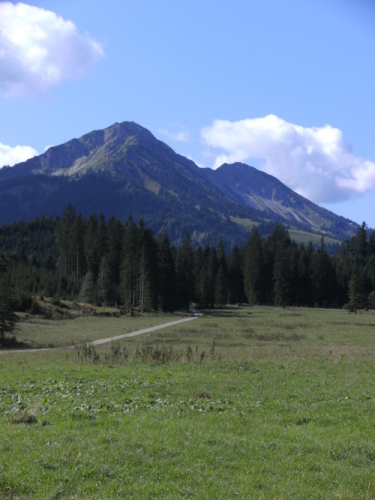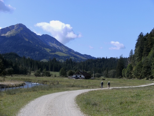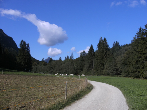 Es geht das Vilstal entlang zunächst unmerklich hinauf. Ich laufe vorbei an der Kalbelehofalpe, dann geht es im Wald erstmals länger ansteigend hinauf. Tief unter mit fließt die Vils. Wieder heraus aus dem Wald erkenne ich an der gegenüberliegenden Talseite das alte Grenzhaus und die Straße zum Oberjoch.