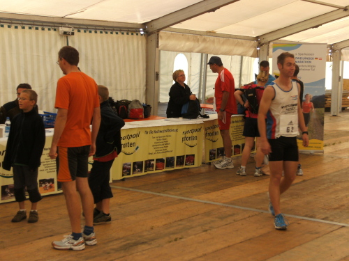 Im Zelt gibt es reichlich Verpflegung. Jeder Läufer erhält ein schönes Funktionsshirt und die Stimmung steigt. Die Siegerehrung findet jedoch erst nach dem Ende des Marathons statt. Die Halben müssen sich somit gedulden.