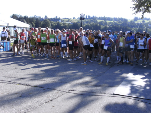 Am Sonntag ist schon mehr los im Zelt und im Startbereich. Ich möchte den Start beobachten und dann zu meinem Privatlauf aufbrechen. Der Startschuss soll durch einen standesgemäßen Böllerschuss erfolgen. Daraus wird jedoch nur ein leises Klicken. Egal, die 31 Marathonis und 120 Halben laufen los. Es herrscht Kaiserwetter. Die Sonne strahlt, aber es ist nicht zu heiß zum Laufen. Perfekte Bedingungen. Vom Start aus geht es durch den Kurpark entlang der Vils bis zu einem Wendepunkt im Vilstal und zurück nach Pfronten. Für die Marathonis zweimal zu laufen.