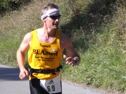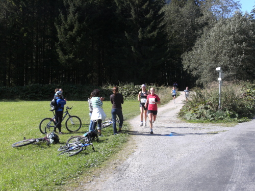 Ich lege meine Montur an und starte im Kurpark zu meinem Lauf. Dabei laufe ich bis zum Wendepunkt auf der Halbmarathonstrecke. Noch vor der Vilstalsäge kommen mir die ersten Läufer entgegen. Der Führende hat schon eine gewaltigen Vorsprung herausgelaufen. Nach wenigen weiteren Läufern kommt auch schon die erste Läuferin. Es ist die erst sechzehnjährige Lisa Staudt, sie wird den Halben überlegen in 1.23 Std. gewinnen! Respekt, eine Wahnsinnleistung.