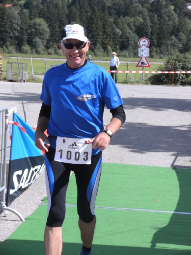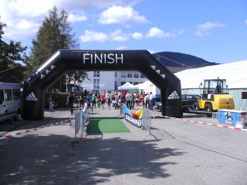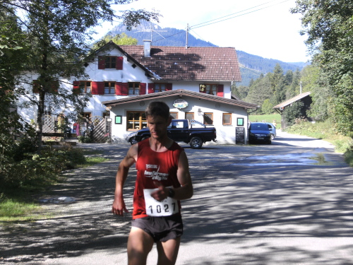 Vorbei an der Dirndlmühle führt die Strecke hinein nach Pfronten. Ich laufe zur Verwunderung aller durch den Zielbogen. Der Sprecher mag mich nicht ankündigen, ich hab ja keine Startnummer. Egal, dafür kündigt er die einkommenden Marathonläufer auf erfrischende und aufmunternde Art und Weise an. Ich bleibe inkognito und als Marathonläufer der Originalstrecke unerkannt.