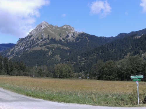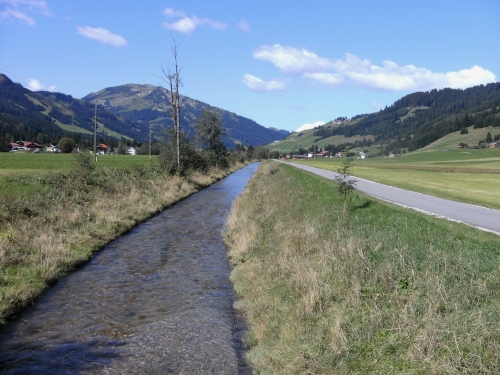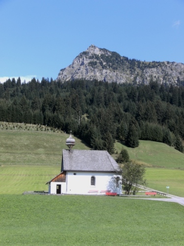 Ich bin im Tannheimer Tal. Im Hintergrund sehe ich Gimpel und Rote Flüh, rechter Hand liegt Tannheim und der Vilsalpsee. Ich bleibe auf dem Radweg entlang der Vils. Linker Hand sehe ich den Einstein. Er ist zwar „nur“ 1866m hoch, bietet aber einen wunderschönen Ausblick. Ich war schon mal oben, daher laufe ich weiter und mache ein Foto mit der schönen St. Leonhard Kapelle im Vordergrund. Der Weg führt nun entlang der Berger Ache über Innergschwend ins Engetal. Vorbei am Campingplatz in Grän geht es zur Wasserscheide der Enge. Hier muss ich ein Stück entlang der Straße laufen. Erst unterhalb der Enge im Vilstal verläuft ein Radweg parallel zur Straße.