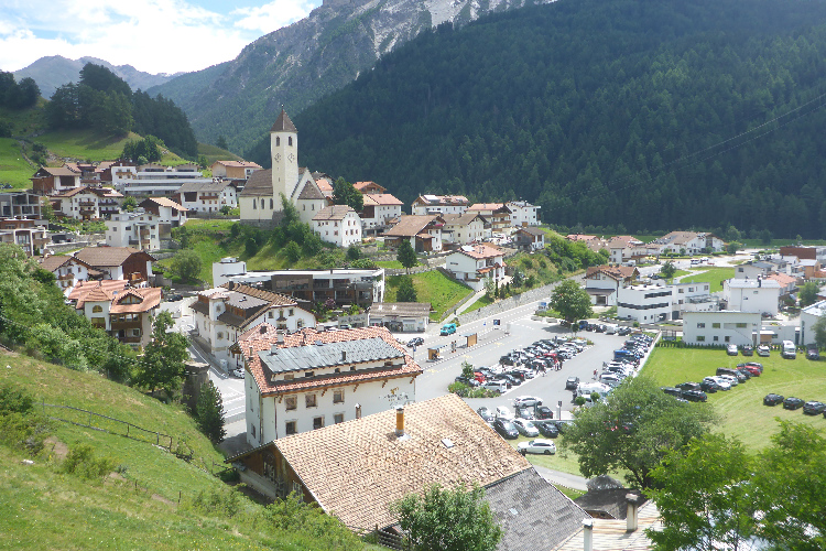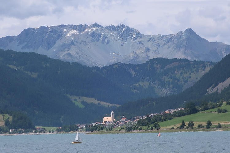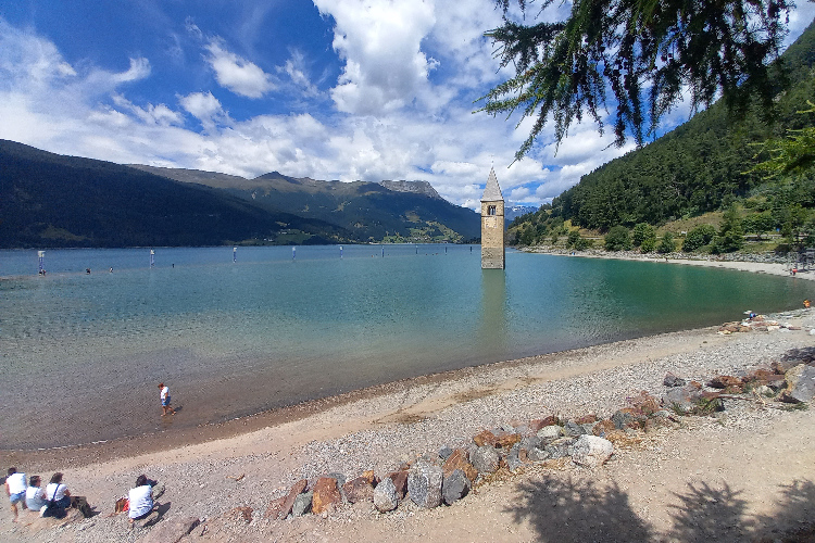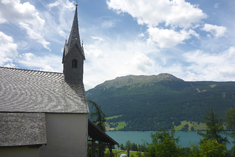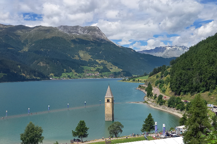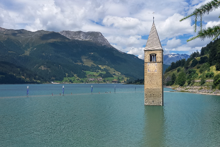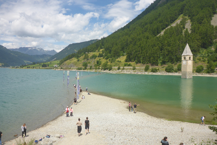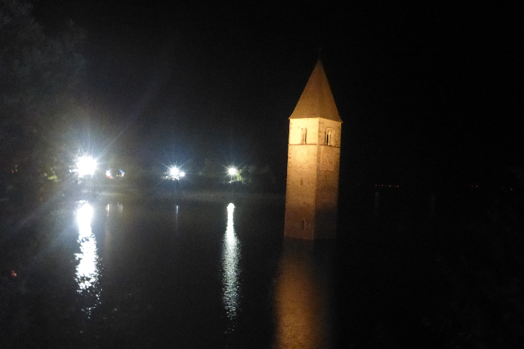 Start und Ziel sind in Graun beim historischen Kirchturm im See.