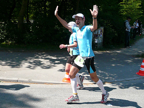Am 08.05. ist wie üblich um 9.00 Uhr am Spiridon-Louis-Ring am Olympiastadion Treffpunkt. Es wurde die neue Münchner Strecke gelaufen, die vom Olympiagelände wie bisher nach Schwabing, dann aber gleich durch den Englischen Garten führt. Weiter geht es durch die Stadtteile Oberföhring, Bogenhausen, Zamdorf und Haihausen. Auf dem letzten Drittel der Strecke reiht sich auf der Marathon-Sightseeingtour durch München ein Highlight an das andere: Rosenheimer Platz, Deutsches Museum, Isartor, Altstadt mit dem Marienplatz, Odeonsplatz, Königsplatz, Ludwigstraße mit Siegestor, Leopoldstraße bis zur Franz-Joseph-Straße. Im Ziel im Olympiastadion wartete das gesamte Team von Handicap International. Eine schöne Überraschung für Claudia und Thomas.
