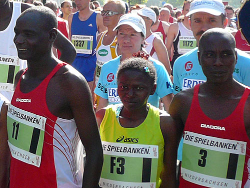 Apropos Laufzeiten: das war für Claudia und Thomas der 9. Marathon in Folge. Ihre Laufzeit in Hannover: 3:47:32 Stunden, locker gelaufen. Viele stöhnten unter der Hitze (20 Grad um die Mittagszeit, danach bis 24 Grad) und ein Blick in die Ergebnisliste verrät, dass die meisten Läuferinnen und Läufer auf der zweiten Hälfte erheblich an Zeit verloren. Die kenianischen Eliteläufer brachen sogar regelrecht ein.