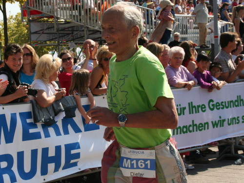 Zumindest von einem Läufer ist bekannt, dass er alle 25 Baden Marathons erfolgreich bestritten hat: Dieter Sanitz aus Karlsruhe. Als M 70 kam diesmal in 4:18 Stunden ins Ziel und belegte damit in seiner Altersklasse den dritten Platz.