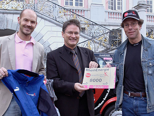 Vor dem Historischen Rathaus, wo am kommenden Sonntag Tausende Teilnehmer die Ziellinie überqueren werden, überreichte Bürgermeister Peter Finger dem Bonner Jürgen Halbig die Startnummer 8.000. „Ich freue mich als Bürgermeister, aber auch als aktiver Teilnehmer des RheinEnergie Marathon Bonn heute den 8.000sten Teilnehmer begrüßen zu dürfen,“ sagt Finger, der am Sonntag für Help e.V. in einer Charity-Staffel mitläuft. Jürgen Halbig ist seit 1994 passionierter Marathonläufer. Der 46-Jährige startet in diesem Jahr in Bonn über die halbe Distanz, auf der er im Vorjahr seine persönliche Bestzeit von 1:58 Stunde erreicht hat. Als kleine Überraschung erhielt der Bonner von den Organisatoren einen Freistart für seinen Lauf am Sonntag, eine Laufjacke und ein T-Shirt von Puma und ein Cappy vom RheinEnergie Marathon Bonn.