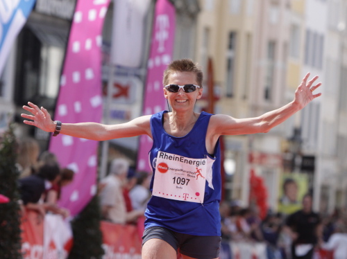Auch der Zieleinlauf bei den Frauen wurde zu einem ganz besonderen Moment. Nach 3:10:26 Stunden lief Birgit Lennartz (LLG St. Augustin) als erste Frau bei der zehnten Auflage des RheinEnergie Marathon über die Ziellinie. Das Besondere: Bereits bei der ersten Auflage vor neun Jahren war Lennartz siegreich gewesen. Zweite wurde Christina Woltmann (TSG Schwäbisch Hall, 3:15:39 Std.), dritte Birgitt Uhlig (3:16:05 Std.), die für die Deutsche Telekom startete.