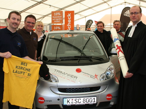 Zahlreiche Verkehrshinweisschilder, Aufbauarbeiten in der Bonner Innenstadt und vor allem das große Zelt auf dem Münsterplatz deuten es an: Die Vorbereitungen für den 8. RheinEnergie Marathon gehen in die heiße Endphase. Heute eröffnete auf dem Münsterplatz die Marathon-Messe. Bis Samstag, 19. April, werden hier Informationen und Sportartikel rund um das Thema Laufen angeboten. Das größte Sportartikel-Sortiment präsentiert auch in diesem Jahr die Firma SportScheck. Der langjährige Partner des RheinEnergie Marathon bietet auf 200m² Ausstellungsfläche Laufschuhe, Kleidung und Laufzubehör. Ein besonderer Blickfang auf der Marathon-Messe ist der RheinEnergie Marathon-smart von CCC-Mobile, den einer der Athleten, der am Sonntag über die Ziellinie läuft, gewinnt und für ein Jahr fahren kann.