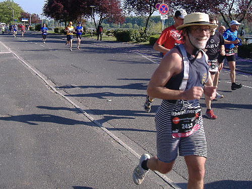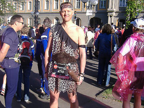 Im Gegensatz zu Köln sieht man in Bonn nur wenige verkleidet am Start. Phil Chadwick aus Großbritannien machte es vor. Er hatte sich als Mann mit Fell und Keule verkleidet – offensichtlich wollte er als Herkules laufen.