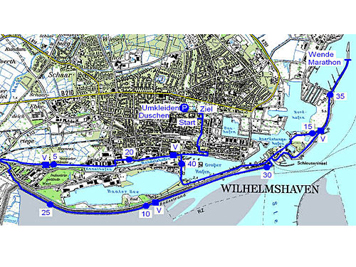 Die Laufstrecke beinhaltet hat das, was ein Kurs an der Küste von einem solchen im Binnenland vor allem unterscheidet: viel Wasser. Es geht über den Friedrich-Wilhelm-Platz, an der Christuskirche vorbei und zur Unterwasser-Forschungsstation OCEANIS am Bontekai. Dann kommt der  Große Hafen und die Deichbrücke, danach der Handels- und Kanalhafen und die Mariensieler Schleuse am Ems-Jade-Kanal.