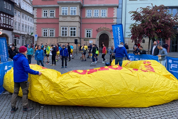 Weil ein Helfer verschlafen hatte, warteten die Organisatoren am Startort Eisenach auf den Torbogen für den Supermarathonstart. 5.40 Uhr traf der Transporter mit dem gelben LOTTO-Thüringen-Torbogen ein, um 5.45 Uhr stand er auf dem Marktplatz in Eisenach. Der Start war aber ohnehin nicht gefährdet. „Die Zeitmessmatten lagen pünktlich bereit. Das ist das Wichtigste“, sagte Wettkampfleiter Stefan Neidhardt.