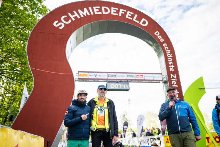 Carlo Brömel, Sohn des Zielortchefs Jörg Brömel, wurde von seinem Vater im Ziel zur erfolgreichen Teilnahme am Rennsteiglauf begrüßt. Als gebürtiger Schmiedefelder ist ihm die Teilnahme immer ein Herzensbedürfnis. Obwohl er inzwischen in Norwegen lebt und dort just zum Termin des Rennsteiglaufs Nationalfeiertag ist, war er am Start. „Obwohl heute in Norwegen gut gefeiert wird, ist mir der Rennsteiglauf doch wichtiger“, sagte Carlo im Ziel ins Mikro von Zielsprecher Rene Pfeuffer.