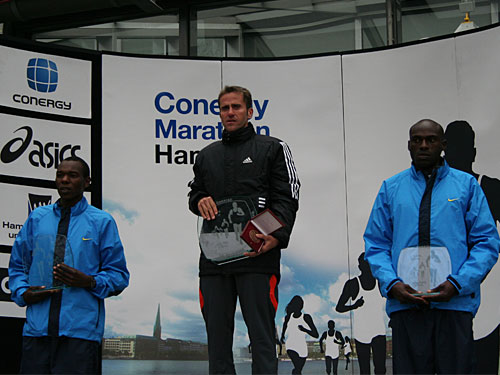 Julio Rey machte sein Ankündigung wahr und verbesserte am Sonntag beim 21. Conergy Marathon in Hamburg seinen eigenen Streckenrekord bei seinem vierten Sieglauf auf nunmehr 2:06:36 Stunden. „Ich fühlte mich gut und wusste, es kann gelingen,“ sagte der sympathische Spanier glücklich. Auf seine Ambitionen bei EM in Göteburg angesprochen sagte Julio, dass er sein Ergebnis von vor 4 Jahren (er gewann Bronze) auf jeden Fall verbessern wolle.