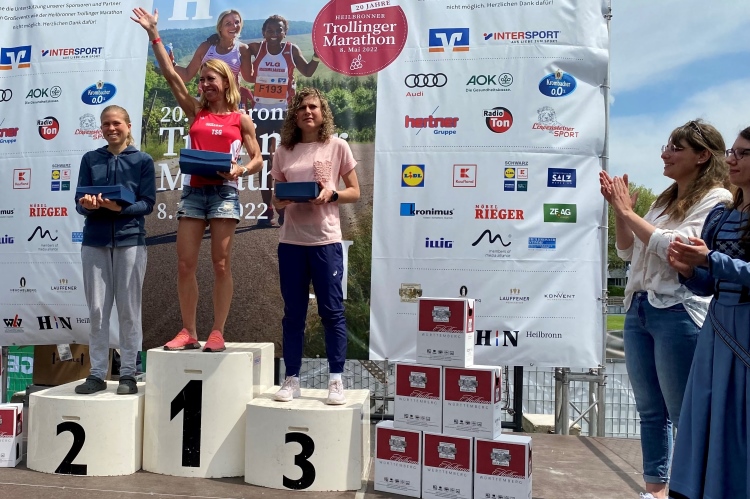 „Die Zeit war mir heute egal, ich wollte nur gewinnen“, erzählt die Gewinnerin des Halbmarathon bei den Frauen, Bettina Englisch - grinst dabei und sieht dafür, dass sie gerade einen Halbmarathon in 1:21:15 gelaufen ist, erstaunlich fit aus. Eigentlich trainiert die 43-Jährige gerade auf die europäischen Seniorenmeisterschaften in der Toskana kommende Woche, aber der Trolli, für den sie im Team der TSG 1845 Heilbronn an den Start geht, war natürlich trotzdem Pflicht, so die Brackenheimerin.