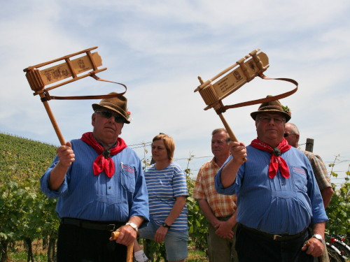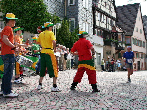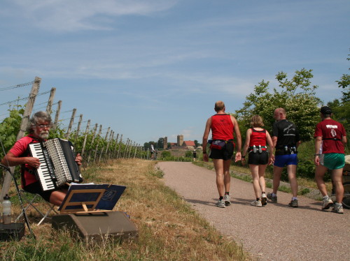 In Brackenheim spielte die Jugendkapelle des Musikvereins, bevor es bei der Weingärtnergenossenschaft durchs Lembergertor aus Barrique-Fässern ging, in Neipperg der Akkordeonverein, in Dürrenzimmern der Posaunenchor und die Mönchsbergrätscher. Wein und Streuselkuchen gab es in Nordheim. Dann blies in Klingenberg der Musikverein Biberach den teilweise Ermüdeten den aufmunternden Marsch und kurz danach die Fürfelder Sumpfhexa Guga. In Böckingen gaben schließlich die Sambanditos, der Musikverein und die Trommler des Käthchen-Hochzeitszuges nochmals den letzten musikalischen Dopingstoß.