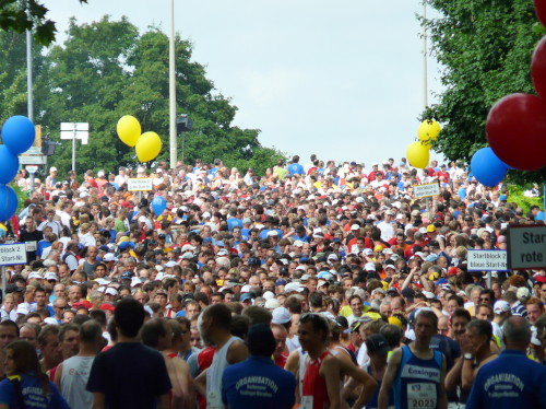 Pünktlich um 9.00 Uhr startete Oberbürgermeister Helmut Himmelsbach mit dem neuen Käthchen Florentina Keller an seiner Seite den Marathon. „Seid ihr bereit?“ feuerte Streckensprecher Achim Seiter die Läufer an: „Ein grandioses Bild“. Dann ein letzter Blick auf die Uhr und ab ging’s mit dem Audi voraus. Der Pulk gab nicht nur für Fotografen minutenlang ein eindrucksvolles Bild. Viele trugen stolz das neue offizielle Trollinger-Marathon-Trikot in den Heilbronner Stadtfarben Rot-Weiß-Blau. Zum Anfeuern war wieder der Vorname der Teilnehmer auf die Startnummer gedruckt. Allein 18 Minuten dauerte der Start des Halbmarathon-Feldes.