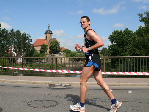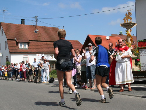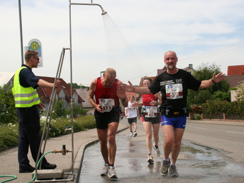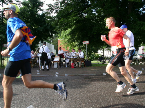 Am Neckar entlang „wuselte“ der Marathon-Bandwurm Richtung Innenstadt und dann nach Süden - aufgemuntert von den Kilometer-Schildern mit motivierenden Sprüchen wie „Laufen macht Spaß“, „Immer schön locker bleiben“, „Genieße die Landschaft“, „Keine Gnade für die Wade“ und „Trollinger hilft der Seele“. Sontheims „trollige Lemberger“ sorgten nach 5 kilometern für musikalische Begleitung. An der Horkheimer Schleuse sorgte der Musikzug „Götz von Berlichingen“ für Stimmung. Den ersten Strecken-„Höhepunkt“ mit 266 Metern zwischen Flein und Talheim erreichten die ersten Läufer bereits nach einer halben Stunde. Den Marathon-Brunch der Fleiner Vereine konnten sie allerdings nicht genießen. Bei Kilometern 10 munterten die Guggenmusiker auf dem Haigern die Läufer auf, die Trommler-Gruppe Rügner aus Leingarten sorgte in Lauffen für Stimmung. Jupiter persönlich feuerte die Läufer in Hausen an.
