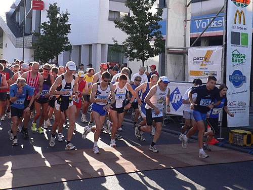 Bereits um 8.45 Uhr starteten die Inliner und Walker in Emmelshausen zu ihrem Marathon, bevor dann um 9.00 Uhr die Marathonläuferinnen und –läufer sich auf den Weg machten. Nach einer Schleife von ungefähr 5 Kilometern und einer ersten Steigung ging es auf den Schinderhannes-Radweg und über Pfalzfeld nach Kastellaun, wo die Bevölkerung für Riesenstimmung sorgte.