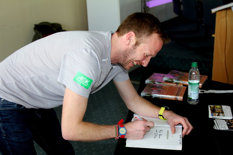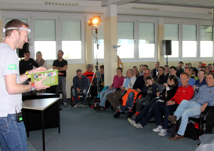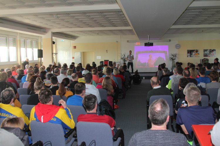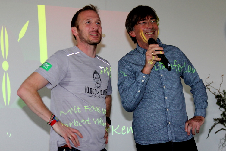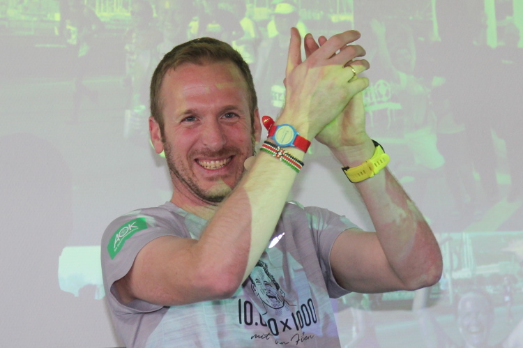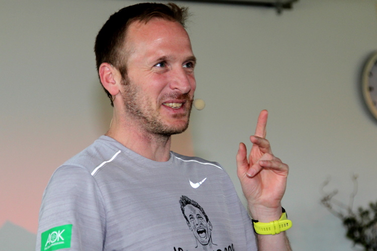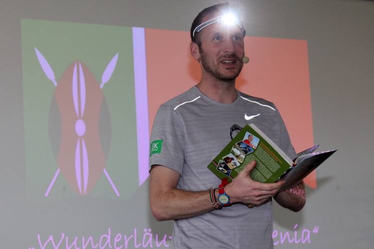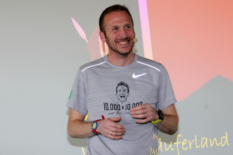 42,195 Erfolgsrezepte Kenias trug er humorvoll, unterhaltsam und lehrreich in Bad Füssing vor – der Saal war bis auf den letzten Platz gefüllt. Er las vor – mit Stirnlampe, denn das erste Training beginnt meist noch in vollkommener Dunkelheit um sechs Uhr morgens. Training mit Plan, auf schnelle Dauerläufe folgt Ruhe; Intervalle im Höllentempo werden abgelöst von Trabpausen. Exakte Notizen und Analysen ergänzen das Training. Jan Fitschen ließ alle Sportler teilhaben und aktiv werden: Er ließ sie aufstehen, um die perfekte Läuferwade zu finden.