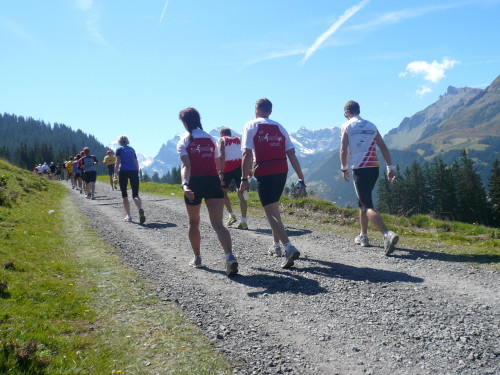 An der Verpflegungsstelle am Ortsausgang von Lauterbrunnen sollte man kräftig zugreifen. Denn jetzt geht es durch den Wengwald auf einem guten aber sehr steilen Weg in Serpentinen hinauf nach Wengen. Erst 3 Kilometer weiter und fast 500 Meter höher gibt es die nächste Verpflegung, dann kommt Wengen (1284 m - km 30) mit weiteren Verpflegungsmöglichkeiten.