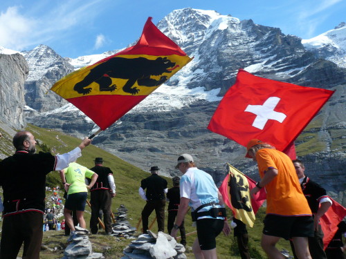 Jetzt beginnt der Jungfrau Marathon erst so richtig. Wer Probleme hat oder knapp in der Zeit ist, sollte hier aussteigen und mit der Bahn zum Zielgelände auf der Kleinen Scheidegg fahren. Man kann sich aber auch auf den nächsten 3 Kilometern mit 300 Höhenmetern noch einmal testen und bei Allmend (km 33) in den Zug steigen und die grandiose Bergkulisse mit Jungfrau, Mönch und Eiger von dort aus genießen.