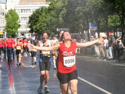 Dr. Ute Giesler (46) und Petra Haas (44) sind die neuen „Plakatheldinnen“ für den Kasseler Marathon. Der Schnappschuss entstand beim E.ON Mitte Kassel Marathon in diesem Jahr, als die Damen den Friedrichsplatz passierten. Petra Haas nutzte die Wasser-Erfrischung aus den aufgestellten Sprenklern mit Wonne und genoss bei den damals heißen Temperaturen die Abkühlung. Freundin Ute Giesler lief direkt dahinter und freute sich über die „ausbreitende Geste“ von Petra. Genau da drückte Fotograf Michael Bald auf den Auslöser. Dem Organisationsteam gefiel das Foto so gut, dass es sich dafür als Werbe-Motiv entschied. So sind sie zum Beispiel auch in der neuen Ausgabe des „Lichtblick“, dem Magazin von E.ON Mitte, als Titelfoto in einer Auflage von 700.000 Exemplaren zu sehen.