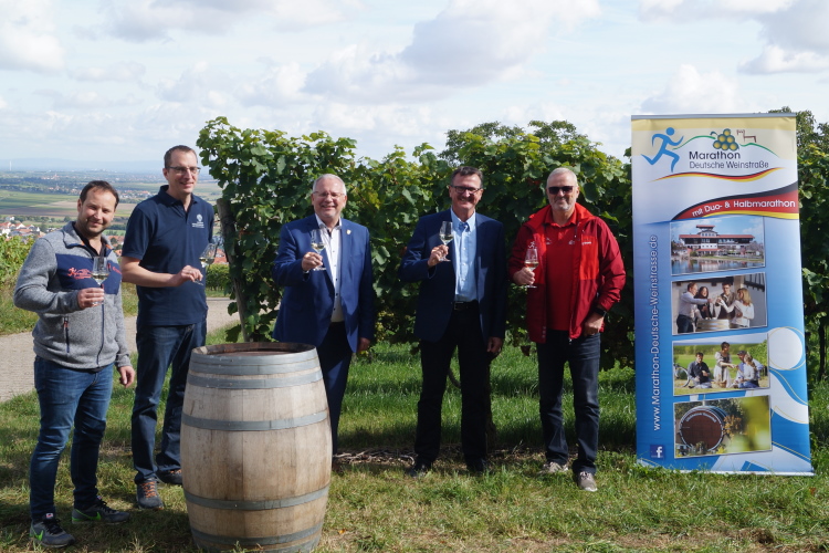 Pünktlich zum Beginn der Anlieferungen trafen sich in der vergangenen Woche der Vorsitzende der Bauern- und Winzerschaft Kurt Janson jun., Winzer Christan Schäfer, Landrat Hans-Ulrich Ihlenfeld, Organisator Rolf Kley und der wirtschaftliche Leiter des Marathons, Klaus Mattern vom TSV Bockenheim (auf dem Bild von links). „Wir haben ein paar der reifen Trauben verkostet, die bald im Marathonwein landen werden und auf den neuen Jahrgang angestoßen. Das wird wieder ein hervorragender Wein, auf den sich die Marathonis freuen können“, ist Landrat Hans-Ulrich Ihlenfeld überzeugt.