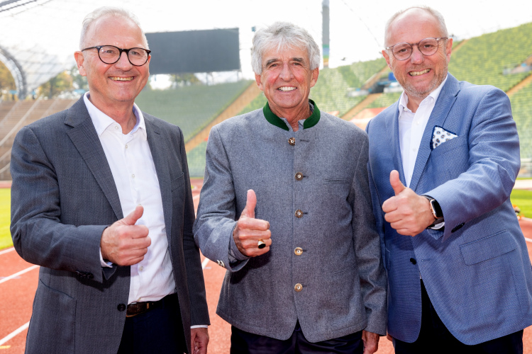 Gernot Weigl, Geschäftsführer MÜNCHEN MARATHON GmbH, und Stefan Göbel, Head of Corporate Identity, Sponsorships + ARTE Generali, mit Frank Shorter (Mitte)
