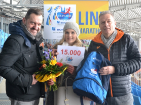 Sehr überrascht und erfreut zeigte sich Marie-Claire Rosenauer aus Haid bei Ansfelden, die als 15.000ste Teilnehmerin zum 15. Jubiläums-Linz Donau Marathon begrüßt wurde.