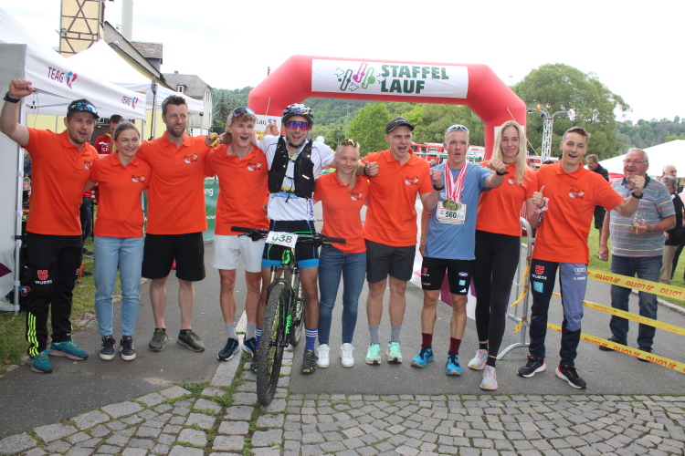 Dahinter entspann sich ein packendes Duell um Rang 2. Die zwölffachen Sieger vom Laufteam Erfurt wollten erklärtermaßen wieder ums Podium kämpfen und übernahmen auf der vierten Etappe den zweiten Platz., den sie auf dem vorletzten Streckenabschnitt an das junge Team vom SC DHfK Leipzig abgeben mussten. Beim Wechsel in Brennersgrün betrug der Rückstand aber nur 48 Sekunden. 6 Minuten dahinter lag der Jenaer Intervallexpress in Lauerstellung. Die Wintersportler, die mit dem Lobensteiner Axel Teichmann einen prominenten Radbegleiter dabeihatten, freuten sich im Ziel über den neuen Streckenrekord von 11:42:16 Stunden. Mit rund 30 Minuten Rückstand folgte die Grün-Weiße Rasselbande der DHfK. „Wir waren schon mehrfach am Start“, sagte Schlussläufer Alexander Enge. Diesmal lief es optimal, so dass der Sprung auf das Podium gelang.