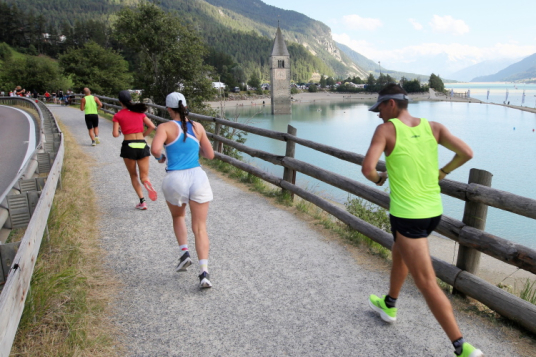 Die 15,3 km Laufrunde, die direkt am Reschensee verläuft, hat Start und Ziel in der Nähe des versunkenen Glockenturms von Graun. Sie ist größtenteils flach und hat einen positiven Höhenunterschied von etwa 90 Metern. Nach dem Start geht es auf den ersten Kilometern entlang des herrlichen Etsch-Radweges mit unschlagbarem Blick auf den Ortler mit seinen 3.905 Metern.