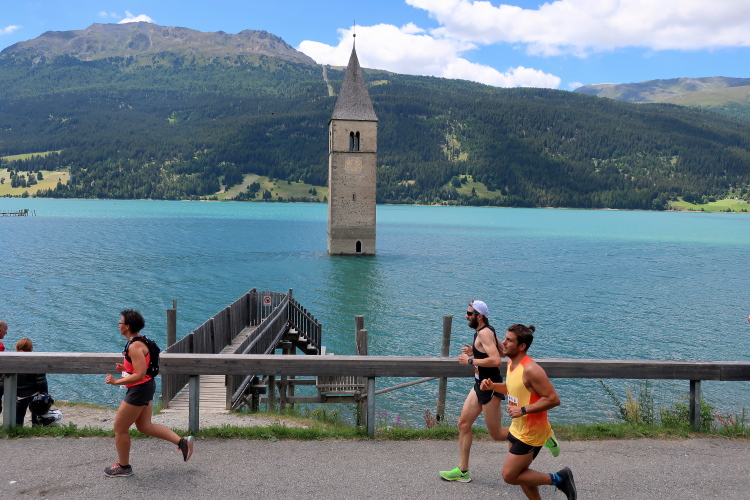 Graun ist Start- und Zielort des 15,3 km langen Seerundlaufs, der zunächst in südlicher Richtung nach St. Valentin, über die Staumauer und auf der gegenüberliegenden Seite des Sees hinauf nach Reschen führt. Der Ortler, der höchste Berg Tirols, wird von seinen 3.905 Metern über die Läuferinnen und Läufer wachen, während sie beim Laufen die Seebrise einatmen. Dann ein letztes Stück hinunter nach Graun und zwei Schläge vom Glockenturm entfernt die Ziellinie, die normalerweise mit Zuschauern gefüllt ist, passieren.