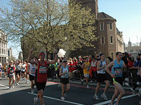Die Streckenführung beim London Marathon ist übrigens so, dass man auch als Breitensportler die Spitzenläufer zu sehen bekommt. Und das wird sich im nächsten Jahr ganz besonders lohnen. Der flora London Marathon am 23. April 2006 verspricht nämlich ein wahres Giganten-Rennen zu werden. Bei den Männern kommt es zur Revanche zwischen Paul Tergat (KEN) und Hendrick Ramaale (RSA), die sich beim diesjährigen NYC-Marathon das knappste Finish der Marathongeschichte lieferten. Beide Läufer stürzten auf das Zielband und Tergat zerriss es nur Zentimeter vor Ramaala, der auf die Straße stürzte. Für die beiden wurden Zeiten von 2.09.30 und 2:09.31 gestoppt.