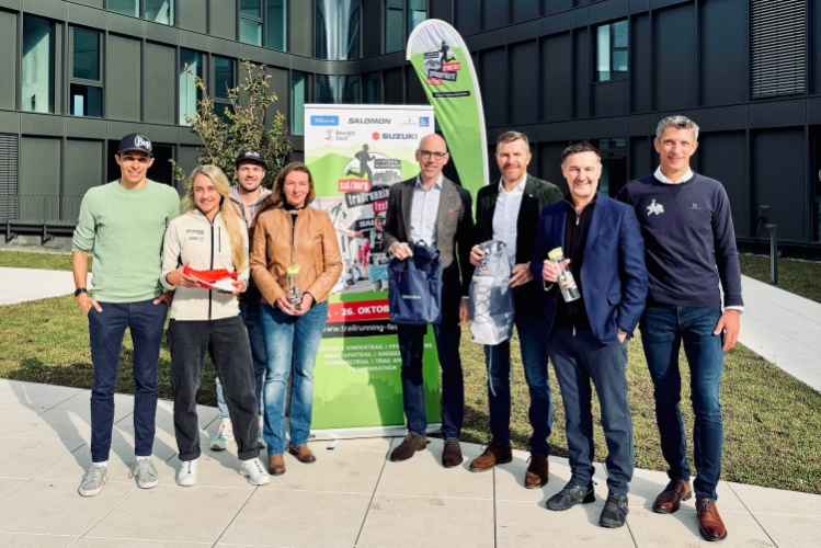 Teilnehmer am Pressegespräch 2025 von links: Daniel Hölzl, Isabell Speer, Tobias Bogner (Salomon), Birgit Berger (Sportunion), Dr. Claus Graggaber (Salzburger Sparkasse), Josef Pöchtrager (UNIQA Salzburg), LR Martin Zauner, Land Salzburg und Josef Gruber (Organisator und Veranstalter)