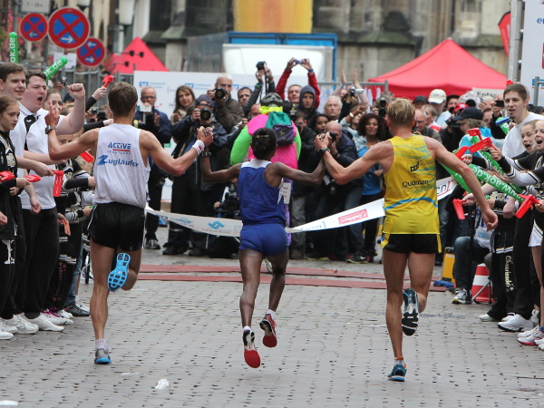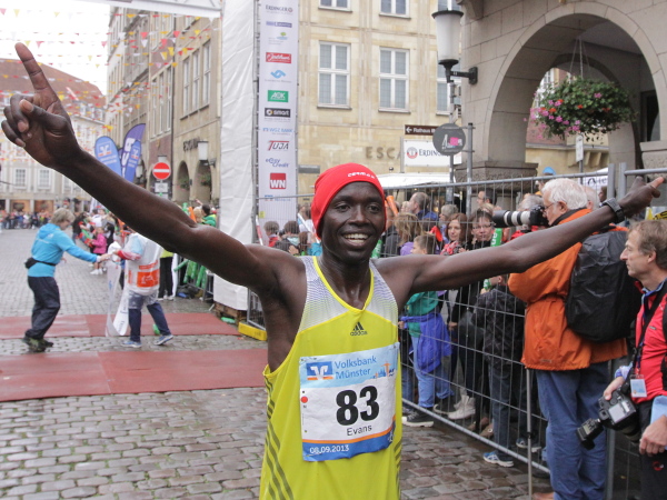 Bei den Männern war der Streckenrekord nie in Gefahr. Schon bei der 10-km-Marke nach 32:55 min. war klar, dass an einen neuen Streckenrekord nicht zu denken war. Die 2:10:25 Stunden sind schon sehr ambitioniert. Es gewann Evans Kipkorir Taiget aus Kenia in 2:15:55 Stunden. "I am very happy to be in Muenster", sagte der 28jährige Kenianer.